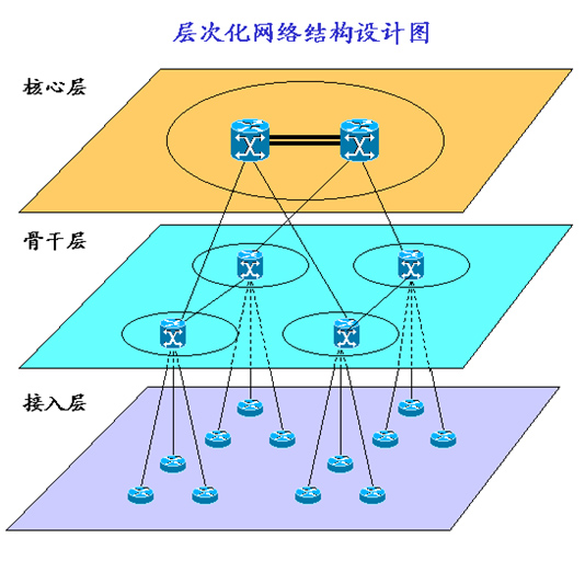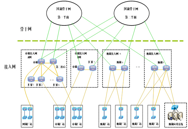 針對(duì)區(qū)域級(jí)電力調(diào)度數(shù)據(jù)網(wǎng)的網(wǎng)絡(luò)規(guī)劃,京海公司提出三層網(wǎng)絡(luò)結(jié)構(gòu)設(shè)計(jì),即核心層、匯聚層、接入層。核心層為網(wǎng)絡(luò)業(yè)務(wù)的交匯中心,通常情況下核心層只完成數(shù)據(jù)交換功能;匯聚層位于核心層和接入層之間,主要完成業(yè)務(wù)的匯聚和分發(fā);接入層主要將用戶(hù)業(yè)務(wù)接入網(wǎng)絡(luò),實(shí)現(xiàn)質(zhì)量保證和訪問(wèn)控制。層次化網(wǎng)絡(luò)結(jié)結(jié)構(gòu)設(shè)計(jì)如下所示: